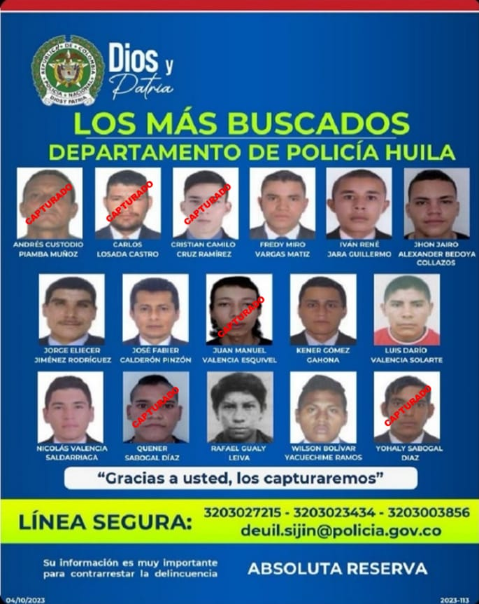 Gracias a difusión del cartel de los más buscados en el Departamento y la oportuna información suministrada por un ciudadano al personal de la Seccional de Investigación Judicial y Criminal del Huila y en coordinación con personal de SIJIN Caquetá se logró la ubicación y captura de Andres Custodio Piamba Muñoz, el cual se encontraba huyendo de la justicia en el municipio de San José del Fragua Caquetá.