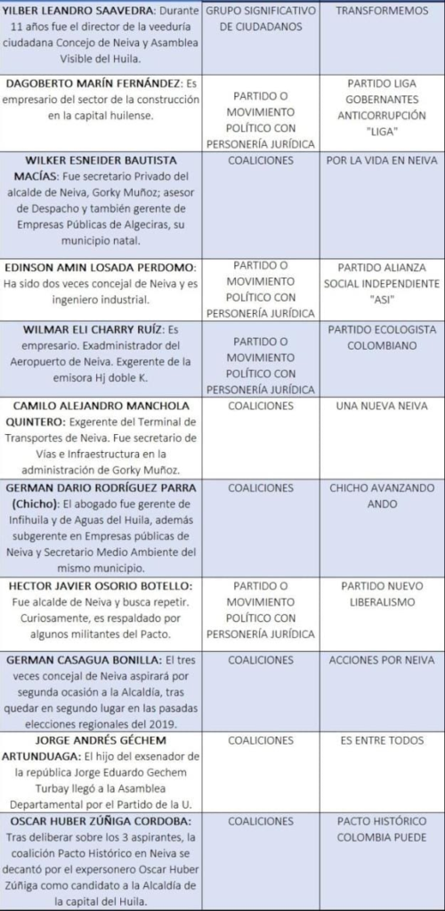 Para el caso de los candidatos a la Alcaldía de Neiva, según los datos de la Registraduría se trata de 11 hombres, de los cuales solo uno cuenta con aval únicamente por parte de un grupo significativo de ciudadanos; Yilber Saavedra.