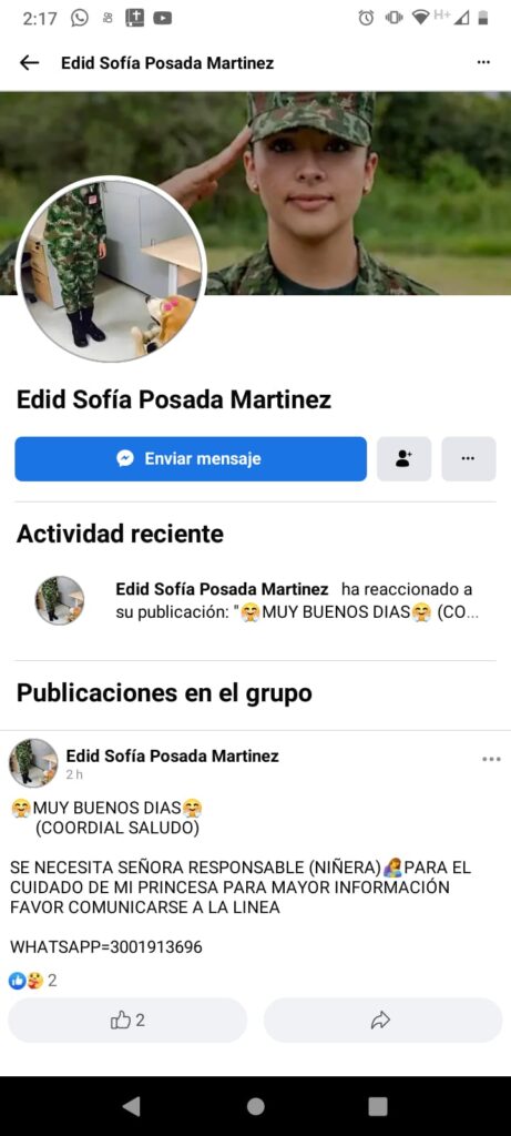 Los delincuentes, utilizando fotos de personal militar, realizan publicaciones en las que se ofrecen empleos, especialmente como niñera.
