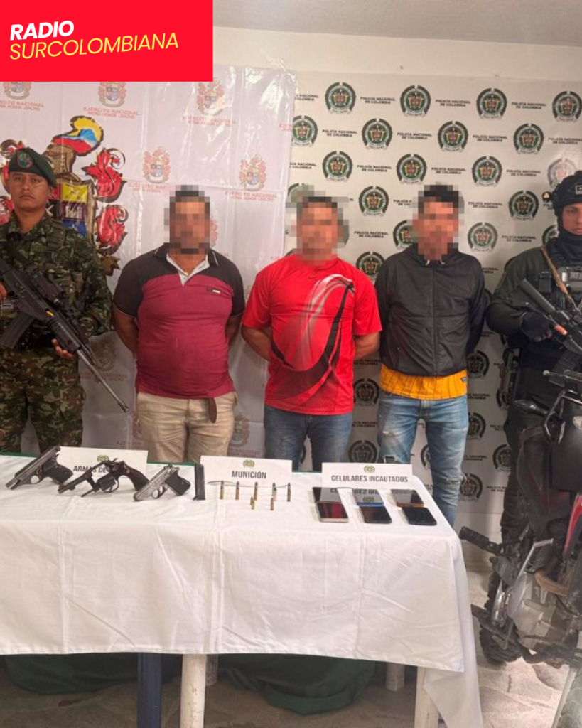 Las capturas se realizaron en operativos simultáneos desarrollados en zonas rurales de Gigante y La Plata, mediante un trabajo articulado entre la Seccional de Investigación Criminal y de Inteligencia del Departamento de Policía Huila, con apoyo de la Fuerza Aeroespacial Colombiana, el Ejército Nacional y la Fiscalía General de la Nación. En estos procedimientos fueron detenidos tres hombres conocidos con los alias de “Pinzas”, “Barbas” y “Mototaxi”, señalados de integrar una estructura armada residual que operaba en el suroccidente del departamento.